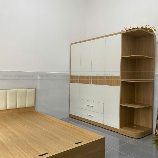 🔹 Tủ quần áo: Kích thước 2m x 2m x sâu 55cm. Thiết kế 4 cánh mở tiện lợi, 1 cánh tích hợp gương soi toàn thân hiện đại. Tủ có thêm kệ hông để trang trí hoặc để đồ, 2 hộc kéo đựng vật dụng cá nhân, 1 ổ khóa hộc giúp bảo mật tốt hơn và 3 thanh inox bền chắc để treo đồ.